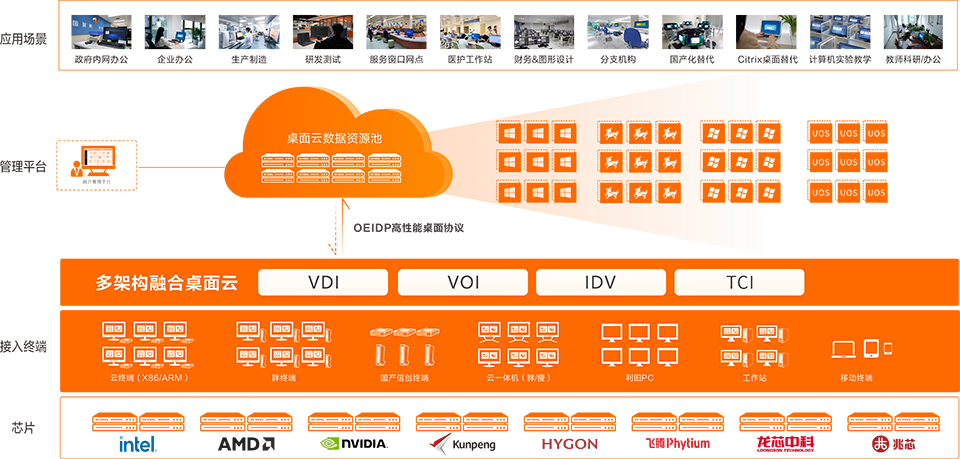 4种主流桌面云技术(VDI/VOI/IDV/TCI) 的深度融合,从6个层次进行融合,界面融合,资源融合,桌面融合,模板融合,数据融合,客户端融合。