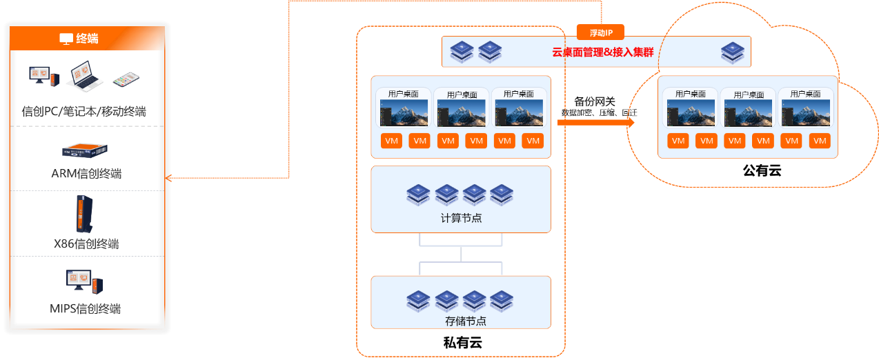通过构建本地生产+公有云灾备的混合云桌面架构,可以实现当本地数据中心发生故障时,可以快速在公有云中启动备用虚拟桌面,极大降低虚拟桌面故障风险。