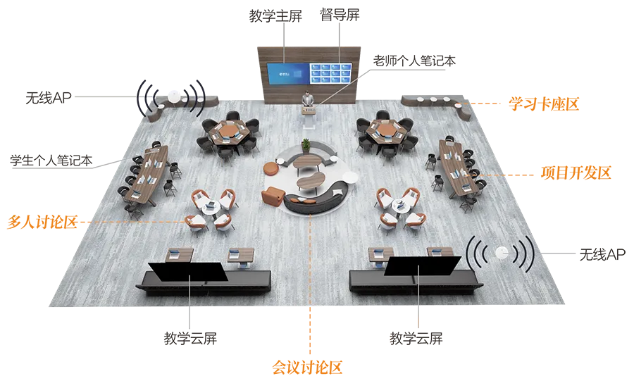 特征:开放空间、移动连接、本地异地同步实验教学、伴随型实训、课外远程实操、学生访客个性化学习