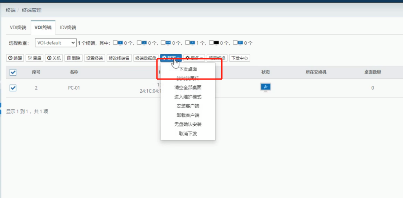 3.待终端状态出现扳手图标时,表示已进入维护模式,点击部署,选择下发桌面