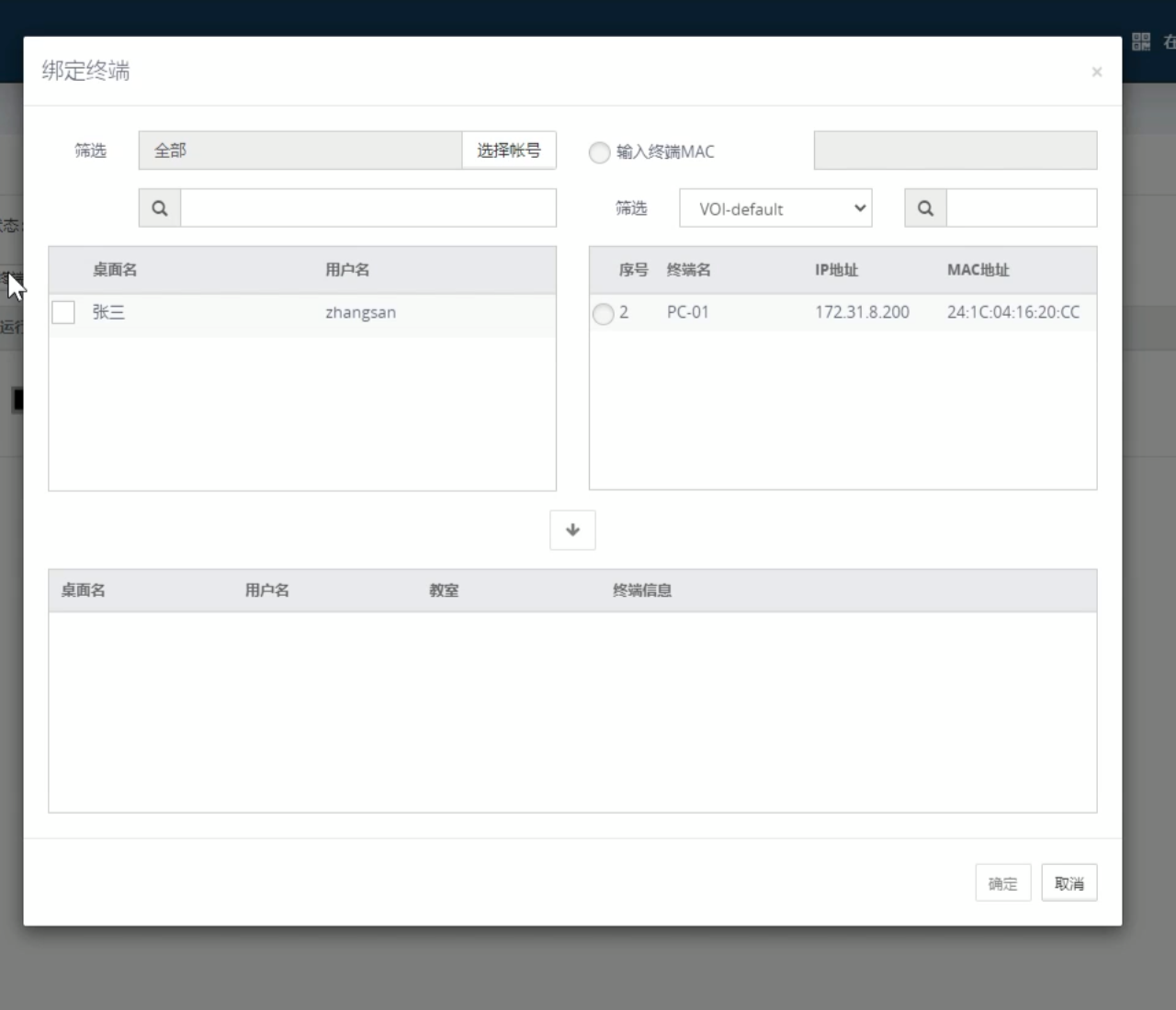 6.在弹出的引导窗口选择相关的桌面名及终端名称进行绑定,绑定后点击确定