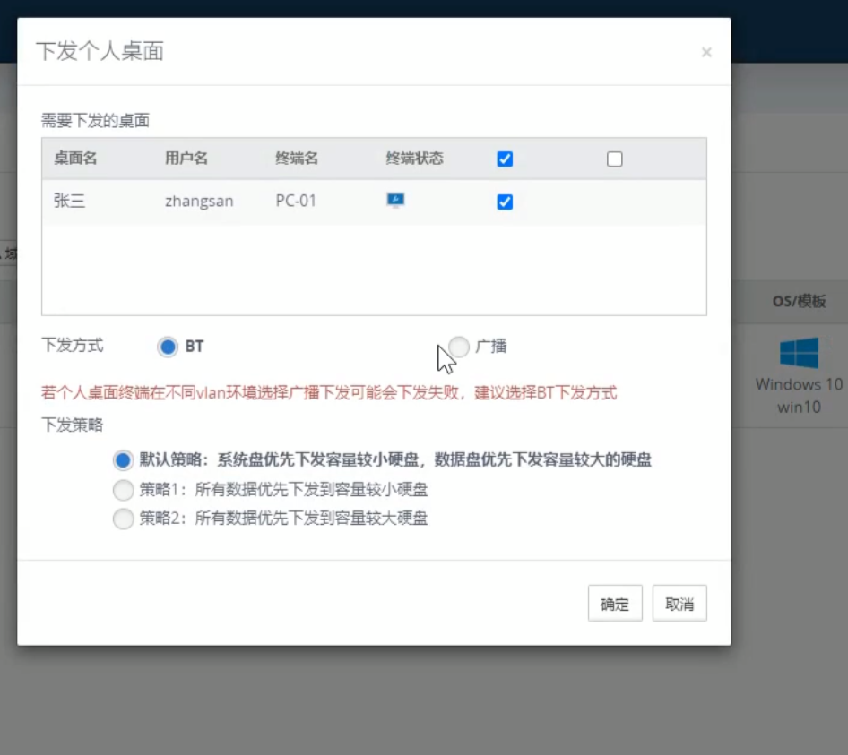 11.勾选需要下发的桌面,下发方式和策略选择默认即可,完成后点击确定