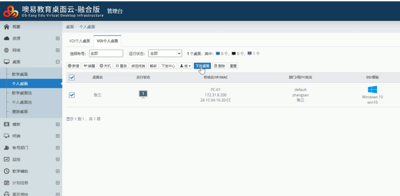 1.登录管理平台,在菜单栏中点击桌面,选择个人桌面,点击新增