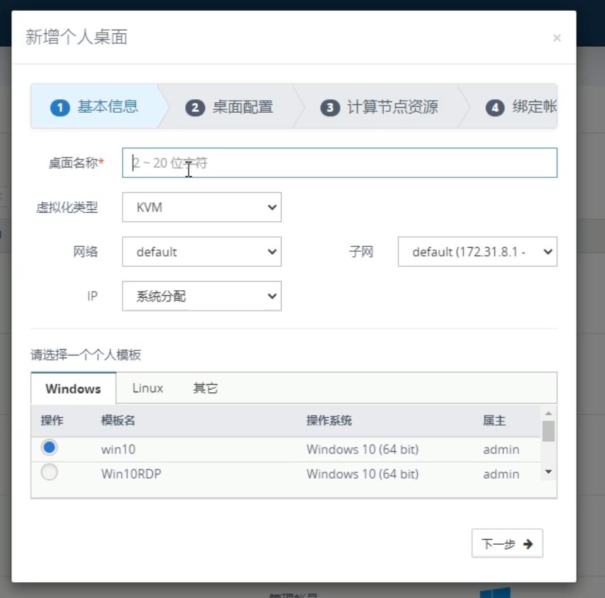2.输入桌面名称,按需求对网络进行配置,选择一个已创建好的个人模板进行创建桌面,选择完成后点击下一步