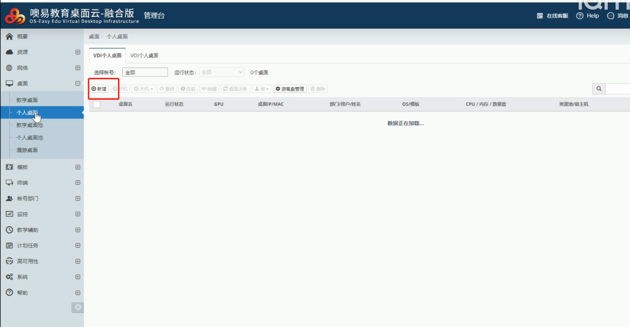 1.登录管理平台,在菜单栏中点击桌面,选择个人桌面,点击新增