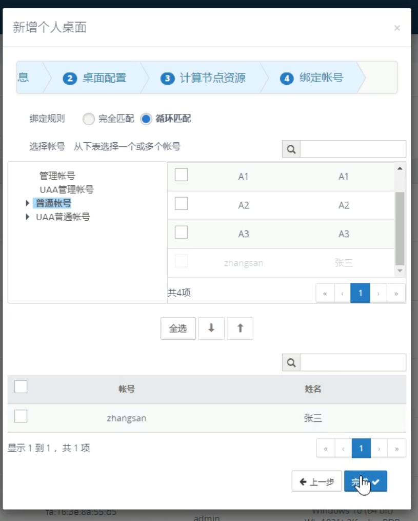 5.选择需要与个人桌面绑定的账号,确认后点击完成后等待个人桌面创建完成即可