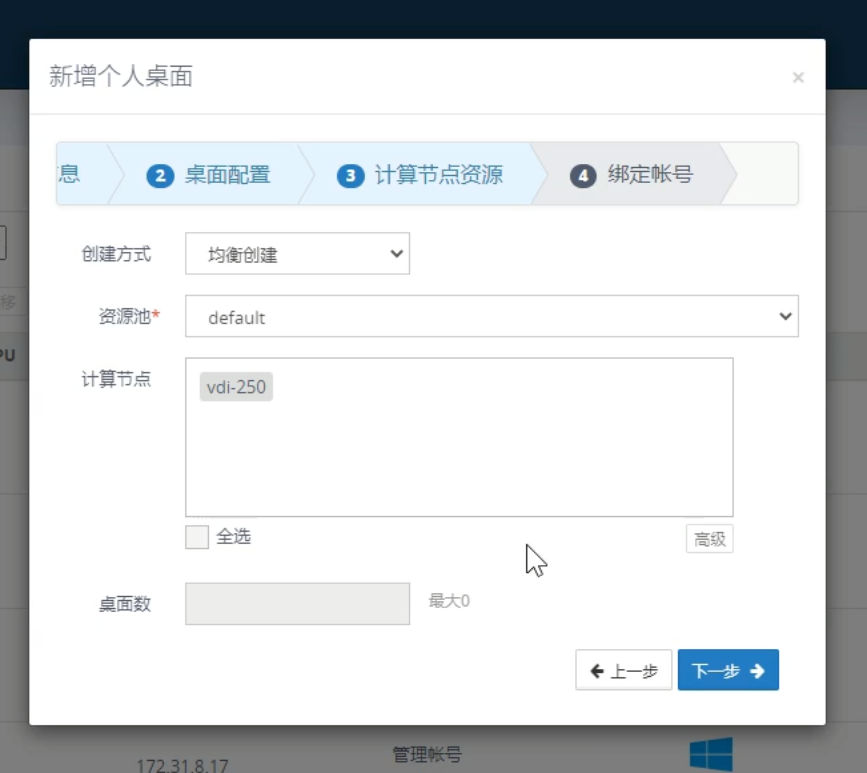 4.选择创建桌面的服务器,根据情况选择创建的桌面数量,输入后点击下一步