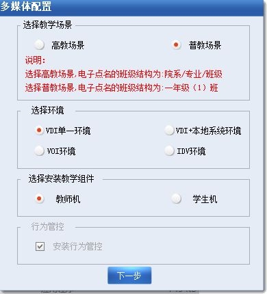 1.安装多媒体教师端时在“多媒体配置”界面中勾选了“安装行为管控”选项后,会在课堂纪律下显示“行为管控”功能,如图所示。