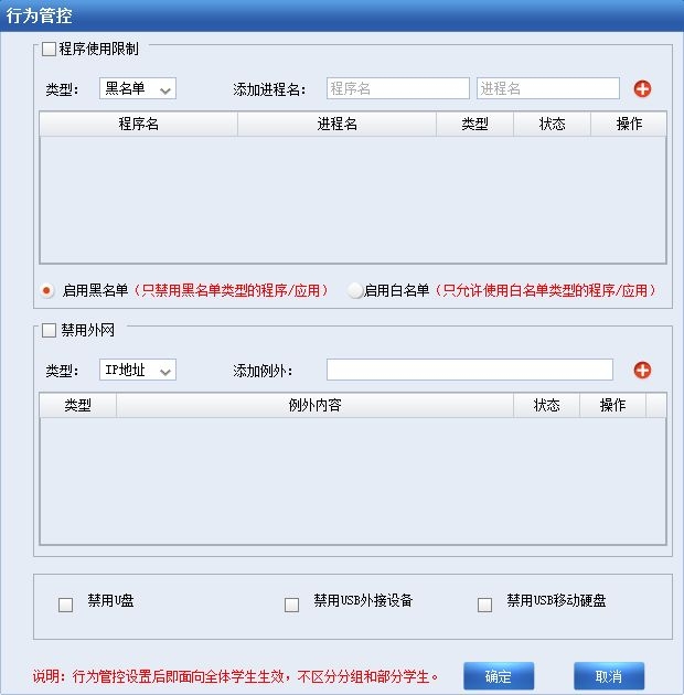 行为管控配置分为程序使用限制、禁用外网、禁用设备三部分,用户可根据实际情况分开使用,也可同时使用。设置后可禁止学生访问黑名单程序,禁止学生访问白名单以外的程序,禁止学生访问外网,禁止学生访问U盘、USB外接设备和移动硬盘。