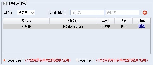 启用黑名单:当勾选了“程序使用限制”,而且单选项为“启用黑名单”时,则学生机上禁止访问列表中类型为黑名单的程序,非黑名单的程序可正常使用。