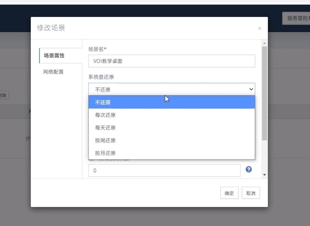 1.首先登录管理平台,【桌面】-----【教学桌面】----选择所要修改的场景,如果是激活状态,先关闭激活,-----选择场景右击------【修改场景】----修改系统盘还原----选择【按周还原】,选择【周一】------【确定】