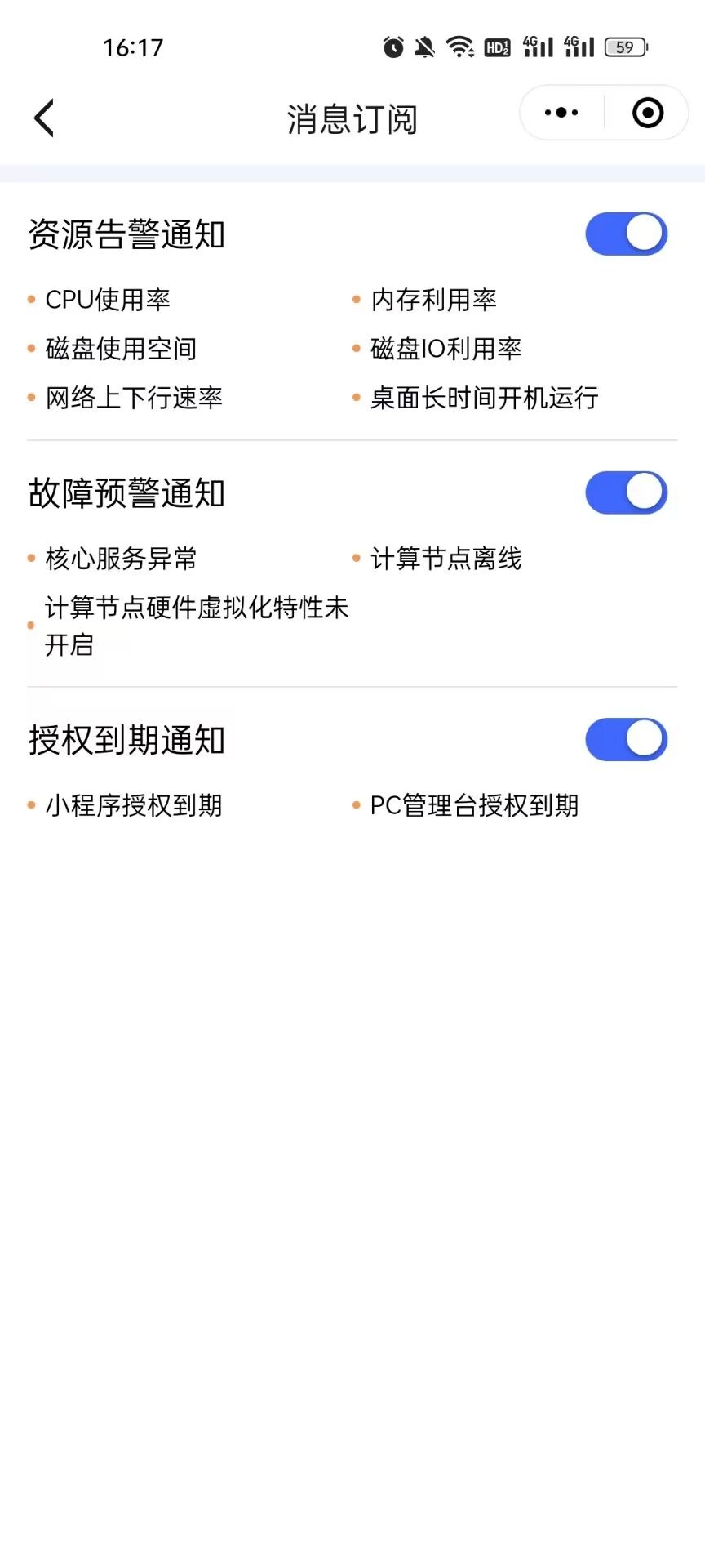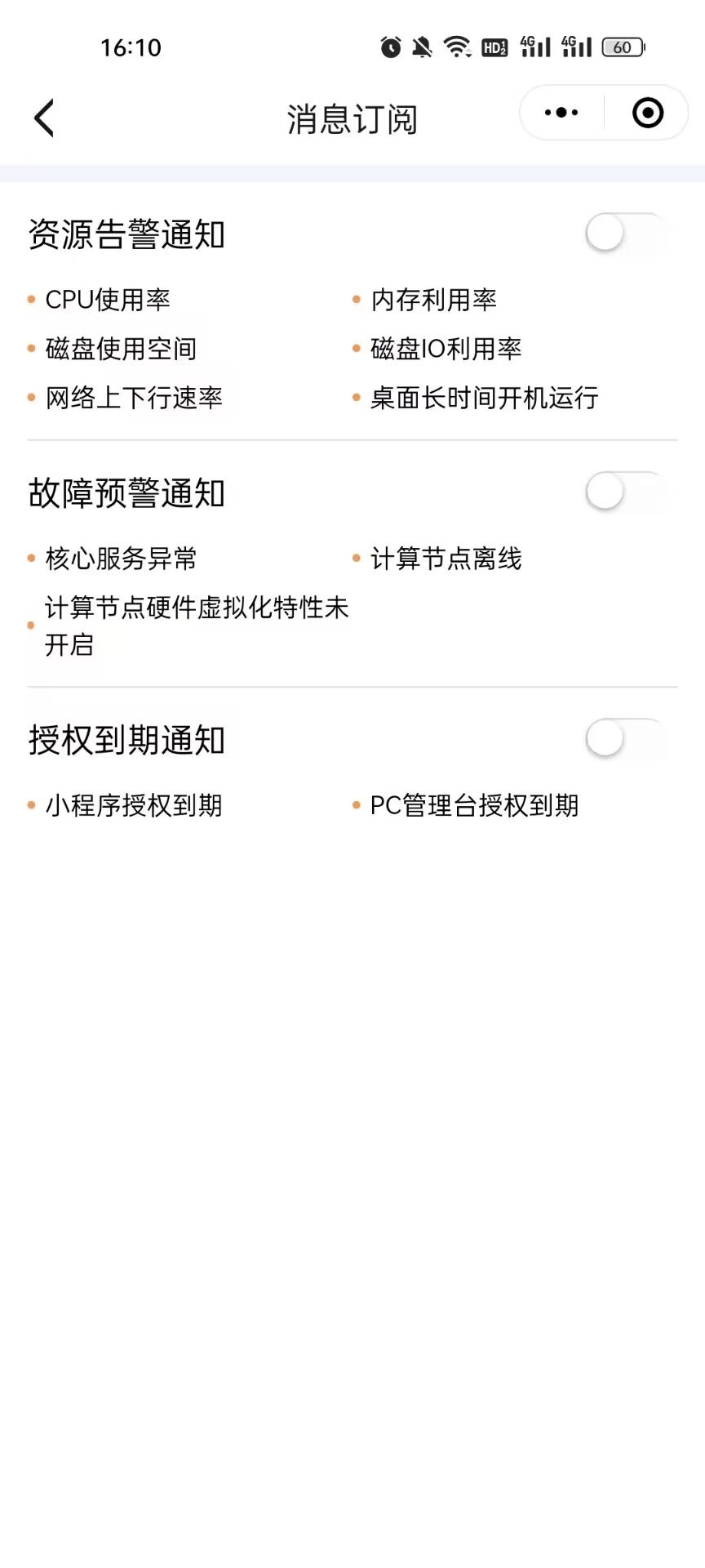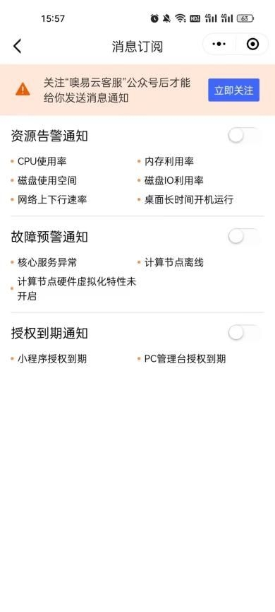 2、点击【开关】,可接收或关闭接收公众号推送的资源告警信息;