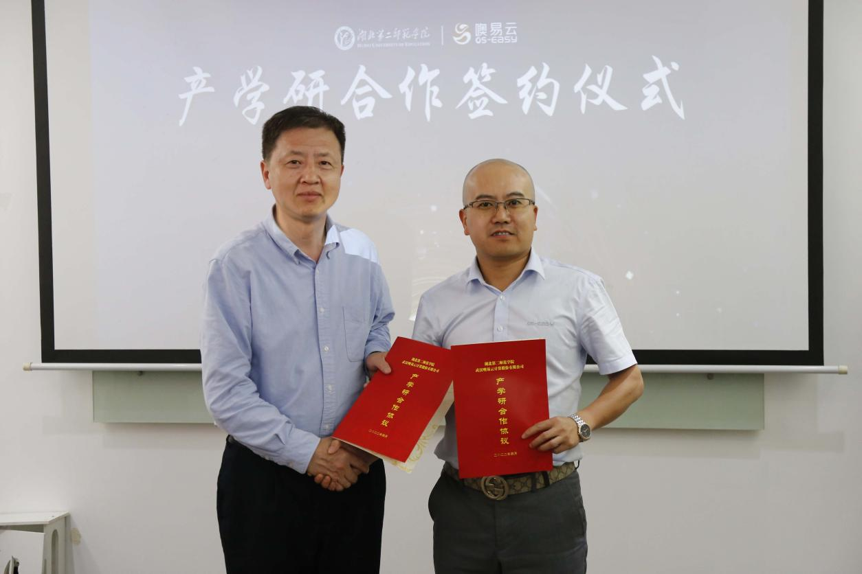 同时,噢易云与湖北第二师范学院计算机学院举行隆重的产学研合作签约仪式,双方围绕“访企拓岗促就业”专项活动,进行资源共享、优势互补、互惠双赢、共同发展。随着此次协议的签订,校企合作再升级,双方将在人才培养与技术培训、共建满足人才培养要求的实践教学基地、本科人才就业合作、创新创业服务、技术交流与科技攻关、科研及科技成果转化合作、共建实验室或工程中心等方面开展深度合作。