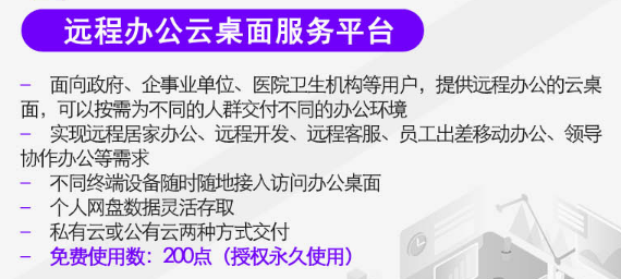 1) 面向政府、企事业单位、医院卫生机构等用户,提供远程办公的云桌面,可以按需为不同的人群交付不同的办公环境;