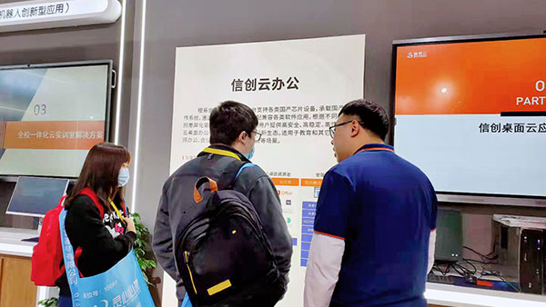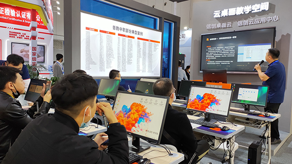 云实训室教学产品现场展示并进行热烈讨论(图) (云实训室展示区交流热烈,云教室系统在各场景中的应用得到专家和领导的认可) 四、 信创云办公,打造可信安全的教学办公环境(加快国产化替代进程) 教育部等六部门印发《关于推进教育新型基础设施建设构建高质量教育支撑体系的指导意见》,意见提出将可信安全新型基础设施作为教育重点发展方向之一。目前, 信创产业主要产品和核心技术已经实现了从“不可用”向“基本可用”的转变,并且正在向“好用易用”大跨步迈进,面临国产终端替代难题,采用桌面云技术是实现国产终端替代过程的最佳方案。 此次展会上,噢易云全面展示 信创 云办公、信创云桌面教学空间、 信创云应用三大产品方案。其中,噢易信创 融合桌面云平台支持各类国产芯片设备,承载国产操作系统,通过云应用技术全面适配兼容各类软件应用,根据不同岗位的差异化需求,按需配置桌面,为用户提供高安全、高稳定、高性能的云桌面办公环境,构筑安全、敏捷、高效的 信创办公应用生态,全面满足中小学计算机云课堂教学、教师 云办公等多场景应用需求。