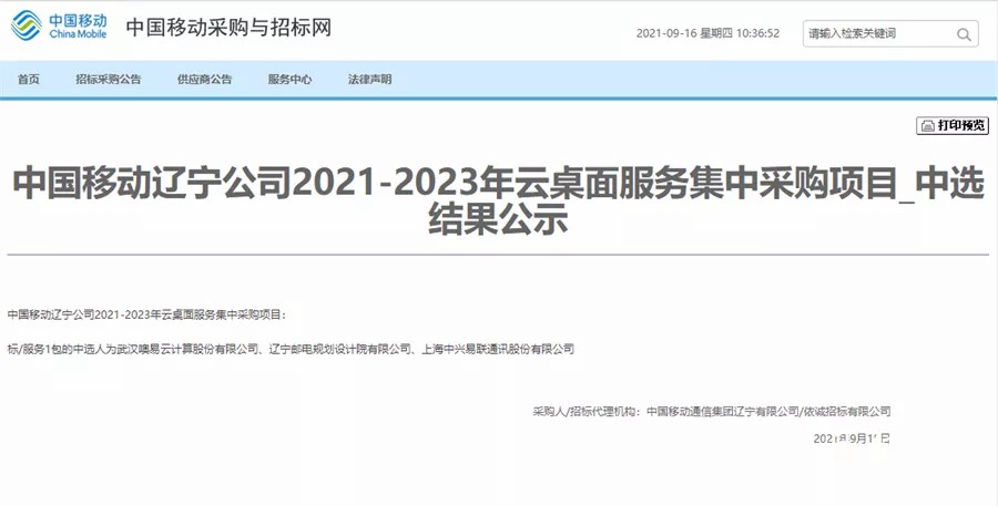 9月15日,中国移动辽宁公司发布“中国移动辽宁公司2021-2023年 云桌面服务集中采购项目”中标结果公告, 噢易云凭借过硬的技术实力和优质的产品服务,从众多竞争对手中脱颖而出,成功入围“中国移动辽宁公司2021-2023年 云桌面服务采购项目”2个包段,中标框架份额为1200万。