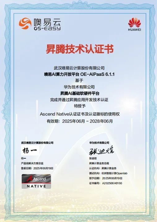 近日,武汉 噢易云计算股份有限公司“噢易AI算力开放平台OE-AIPaaS”与华为技术有限公司“昇腾AI基础软硬件平台”完成并通过昇腾应用开发技术认证, 噢易云取得昇腾技术认证书。此次成功认证,是双方深化合作的一项重要硕果,标志着双方将携手共建人工智能生态体系,对推动人工智能行业深度应用发展与国产化具有重要意义。