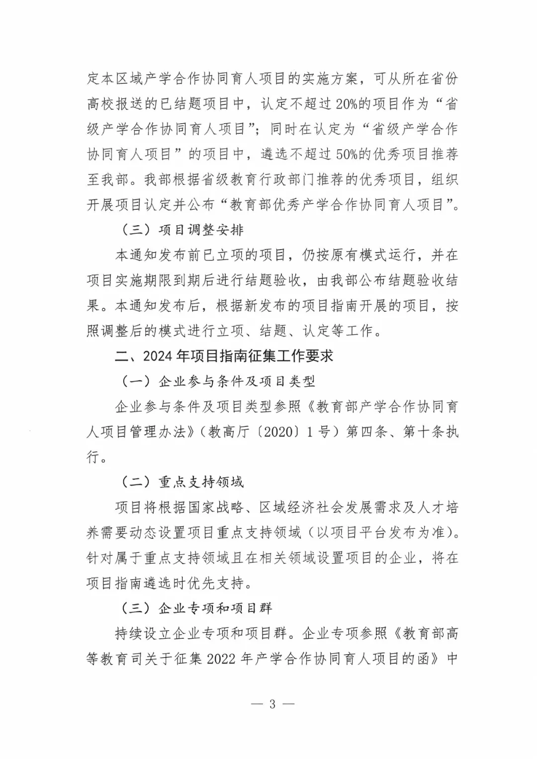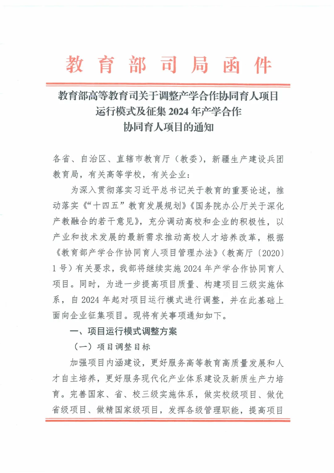 教育部高等教育司关于调整产学合作协同育人项目运行模式及征集2024年产学合作协同育人项目的通知