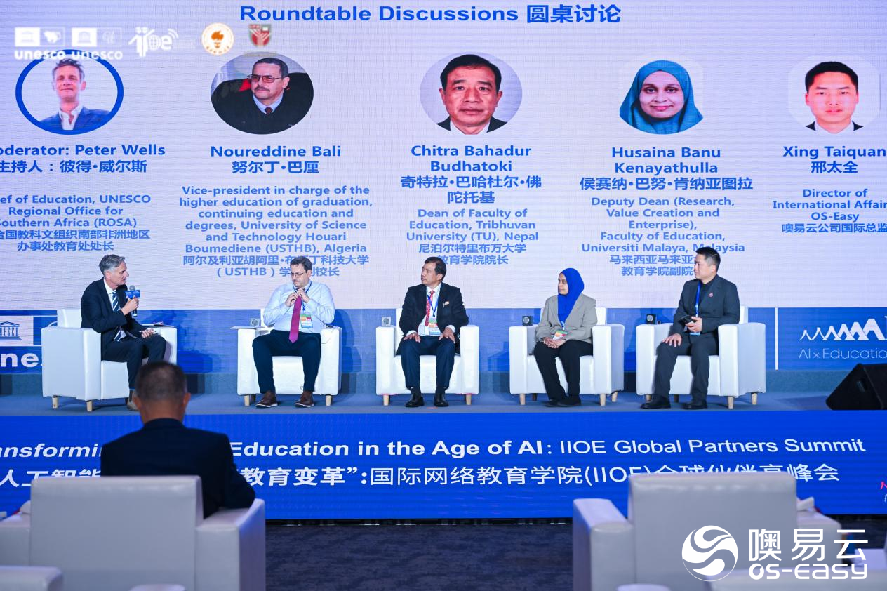 在微证书提升高校教师职业发展的圆桌论坛环节,噢易云国际市场总监邢太全与马来西亚马来亚大学教育学院副院长Husaina Banu Kenayathulla、尼泊尔特里布万大学的院长Chitra Bahadur Budhatoki、阿尔及利亚胡阿里·布迈丁科技大学(USTHB)学术副校长Noureddine Bali等嘉宾探讨了教师职业发展的重要性和方法、微证书项目及其对教师的价值、AI技术在高等教育中的应用和挑战、混合式学习的延续和重要性。