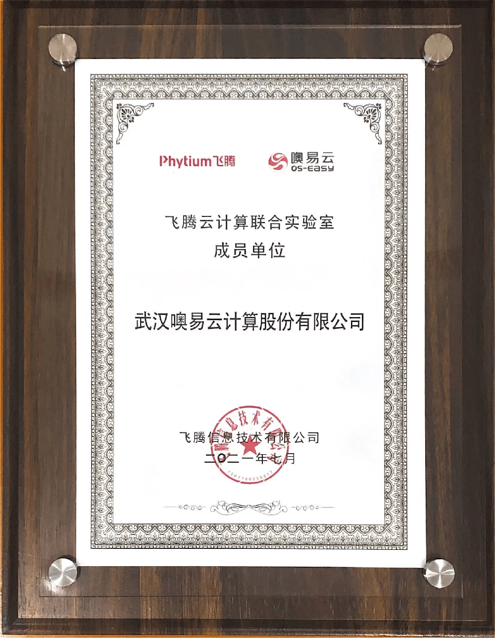飞腾云计算联合实验室成员单位证书(图)