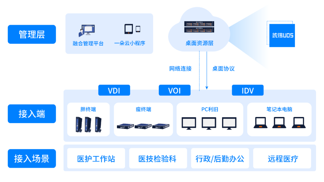 全域终端统一接入管理:通过融合管理平台对医院所有终端统一管理,实现界面、资源、终端、模板、数据五个层面的融合管理。
