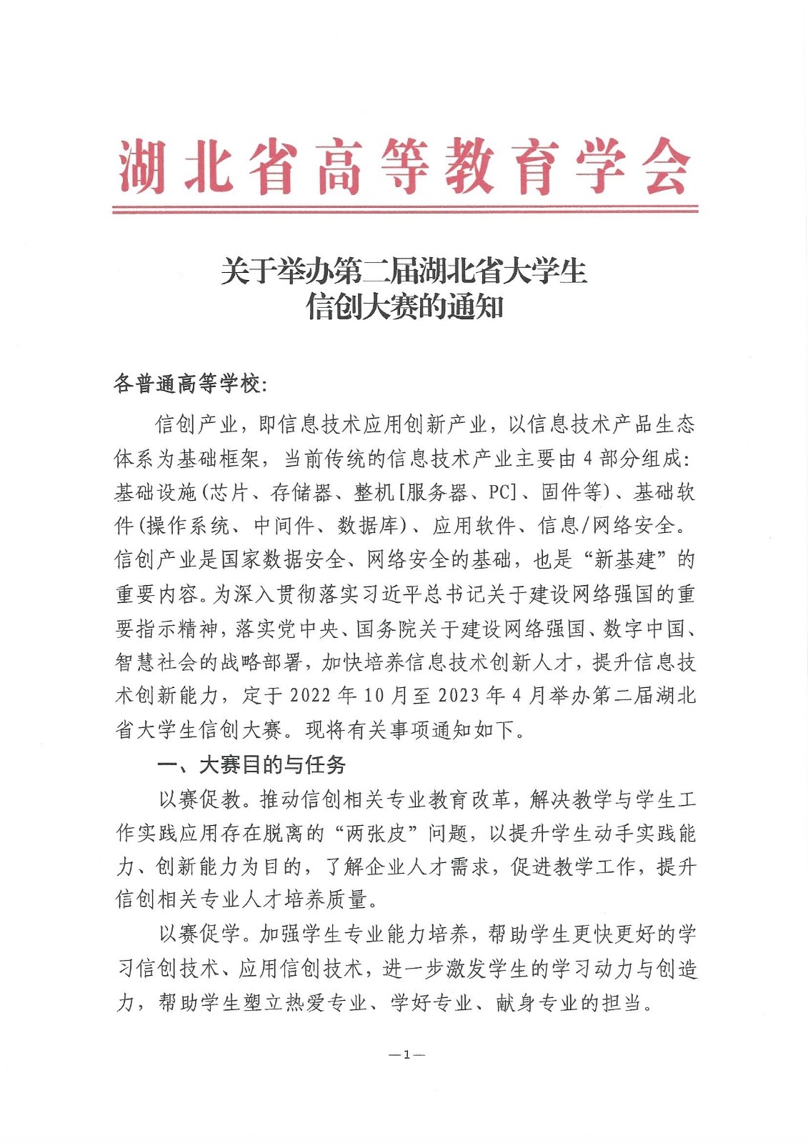 关于举办第二届湖北省大学生信创大赛的通知
