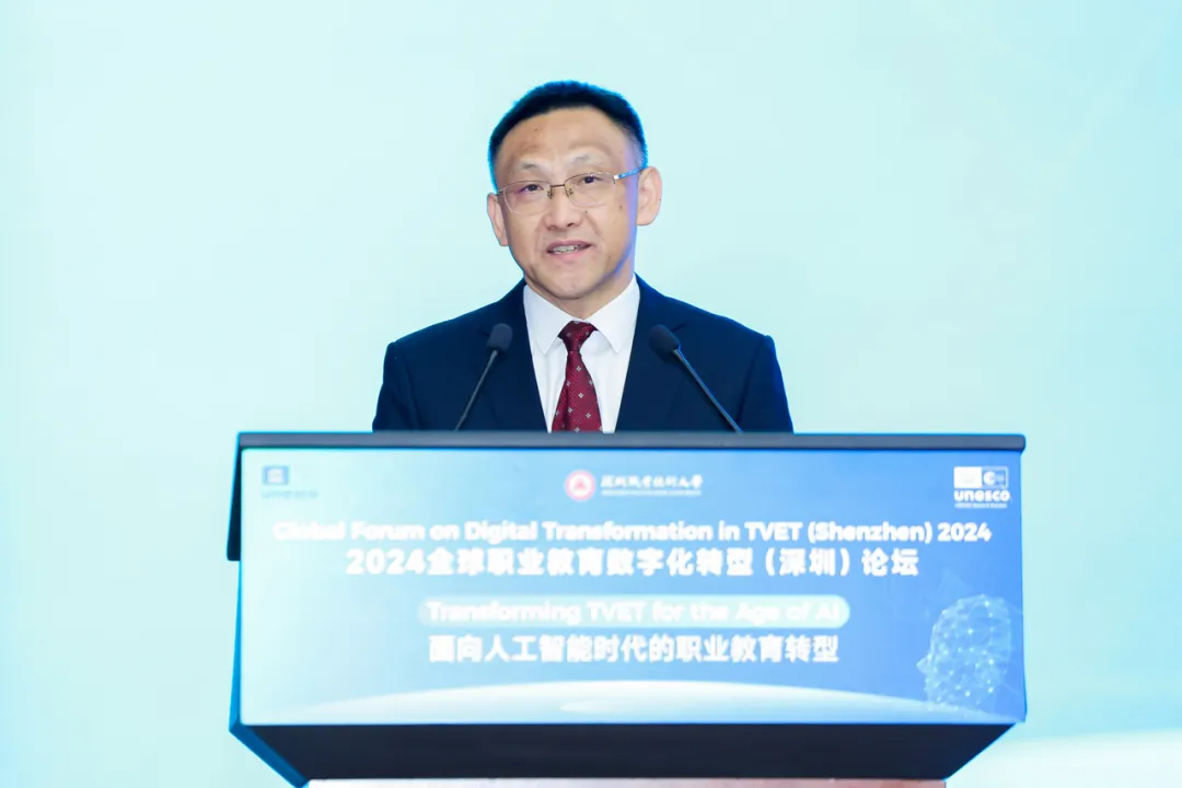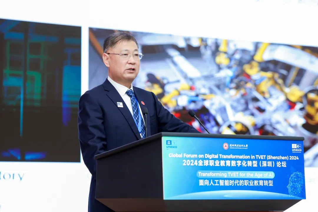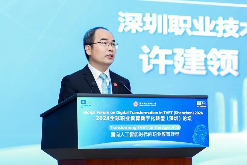 深职大党委副书记、校长许建领在致辞中回顾了深职大的国际合作成果,表示学校将继续大力支持职业技术教育数字化教席工作,并愿意与教科文组织和世界各国开展职业教育数字化转型的深度合作,为全球职教数字化发展贡献力量。