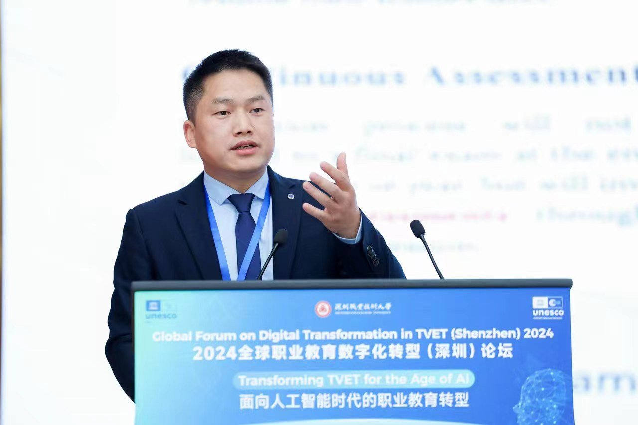 10月22日至23日, 2024全球职业教育数字化转型(深圳)论坛在深圳职业技术大学(以下简称“深职大”)成功举行。本次论坛由联合国教科文组织国际职教中心(UNESCO-UNEVOC)、联合国教科文组织东亚多部门地区办事处及深职大共同主办。来自35个国家的政府部门、教育机构、行业企业和国际组织的近130位代表出席论坛,聚焦“面向人工智能时代的职业教育转型”,共同探讨全球职业教育数字化治理与人工智能技术融合的路径,分享各国在数字能力建设、课程改革及科技助力校企合作方面的最佳实践,推动构建一个更具韧性和活力的全球职业教育体系。噢易云作为联合国教科文组织战略合作伙伴亮相此次大会,噢易云国际市场总监邢太全发表主题演讲,针对数字场景下的职教创新,包括智慧教室资源库、线上线下实验教学新模式、以及海外丰富的落地案例实践,和与会代表分享交流。