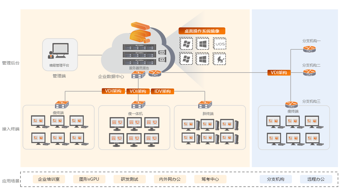 面向企业生产、研发测试、分支机构等各类办公场景,提供VDI/VOI/IDV 三种融合架构的企业云电脑办公解决方案,满足企业办公复杂的应用场景需求,快速解决桌面环境故障,减少运维成本。