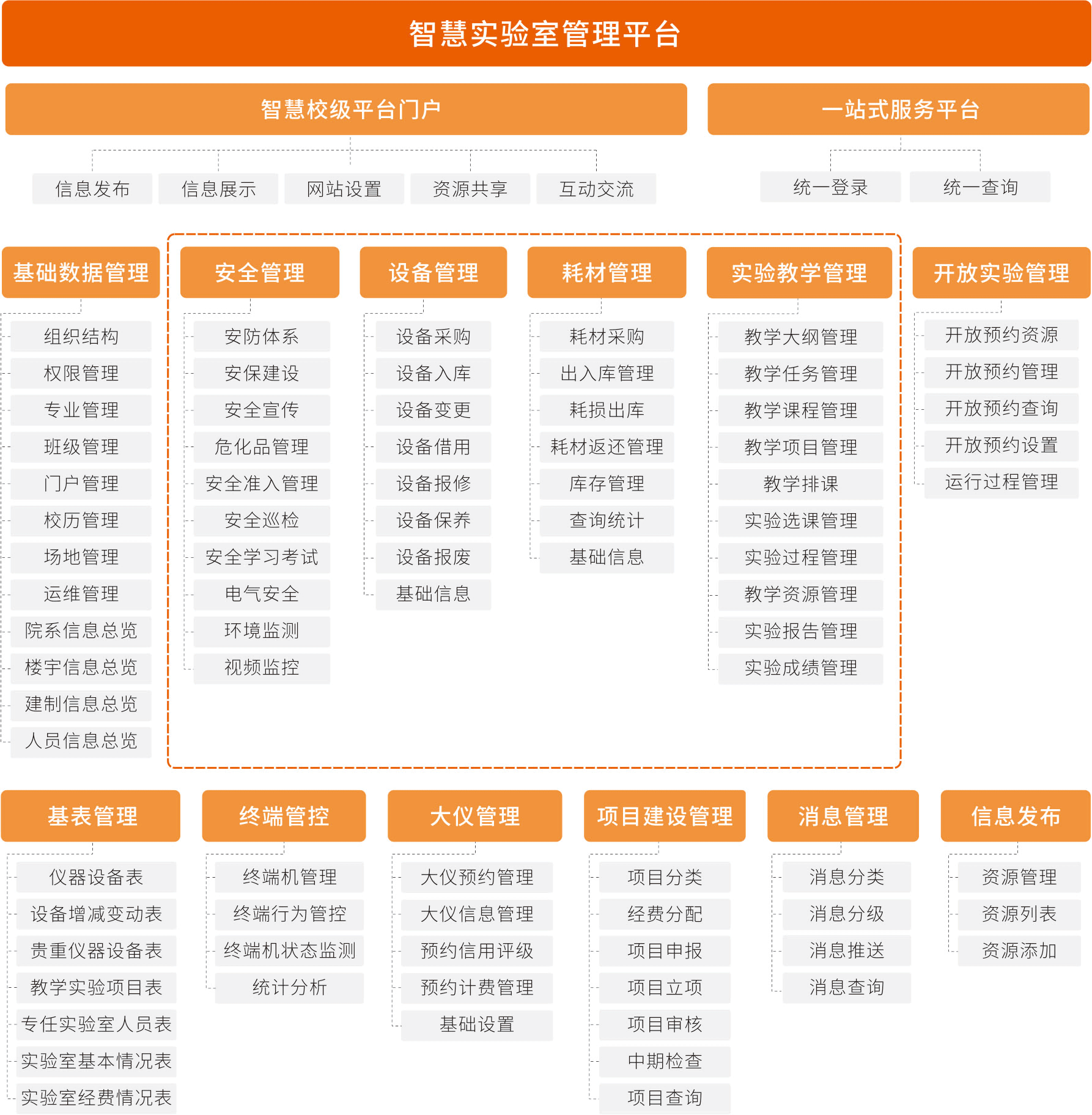 智慧实验室管理平台采用模块化方式组建,可灵活搭配使用,满足各类实验室的管理需求;同时,用户可根据自身权限对系统进行基础数据维护、控制策略设置、远程控制、分析查询等操作,实现对实验室日常管理智能化。
