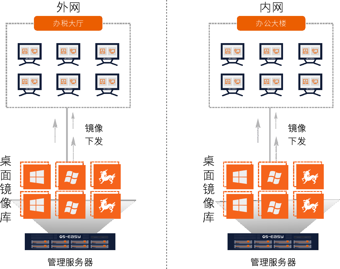 充分考虑税务系统内外网隔离要求,在机房内外网分别部署一台桌面服务器,对内网办公环境和外网办公环境提供云桌面服务,内外网完全隔离,满足蔡甸税务信息安全管理要求。