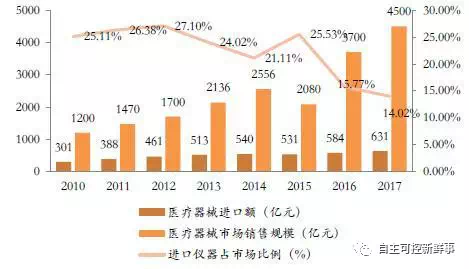目前,我国在国产医疗器械的竞争力正逐步增强,2017年我国进口医疗器械进口额为631亿元,占我国医疗器械市场销售规模的14.02%,较前几年有明显下降趋势,国产替代逐步加速。