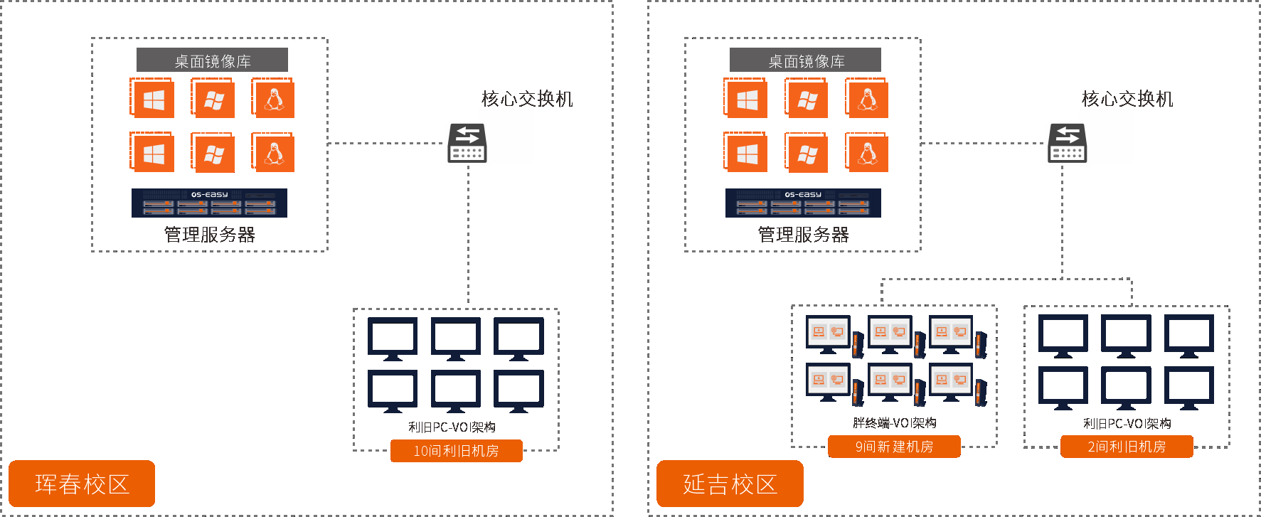 延边大学延吉校区和珲春校区共18间计算机公共机房,均采用VOI架构的融合桌面云,针对不同批次、不同配置的异构终端,单一的融合管理平台实现跨楼层、跨楼栋、跨机型的统一管理,大幅度降低管理维护难度。