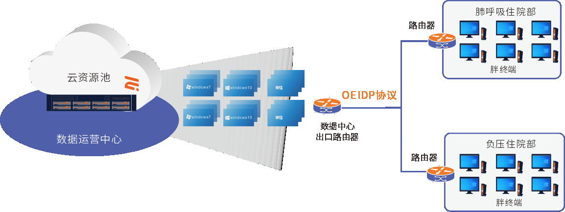 哈尔滨市第六医院为紧急应对突发的新冠疫情,提前启用新冠救治中心,携手噢易云部署80点云PC系统,80台云终端,80点桌面服务数据分析与管控平台,分布在肺呼吸住院部和负压住院部,保证医疗系统的运行高可用性及连续性,医护人员通过各种终端接入虚拟桌面云端办公,实现随时随地任意设备连接访问HIS业务系统,运维人员无需频繁出入院区,降低感染风险。
