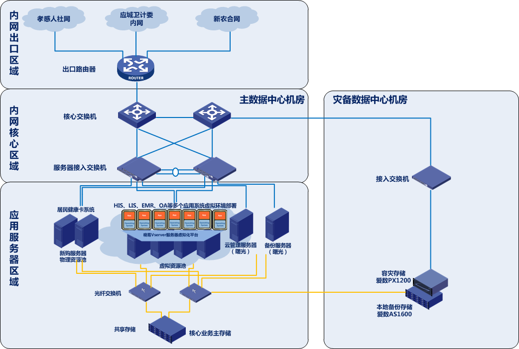 采用主备存储搭建模式,当主存储故障后,备份存储能自动接管应用资源,达到应用备份的目的,同时通过虚拟化一体备份软件,将业务数据、系统数据、管理数据、整体备份到异地远端,增加主机房灾难情况下的数据安全。