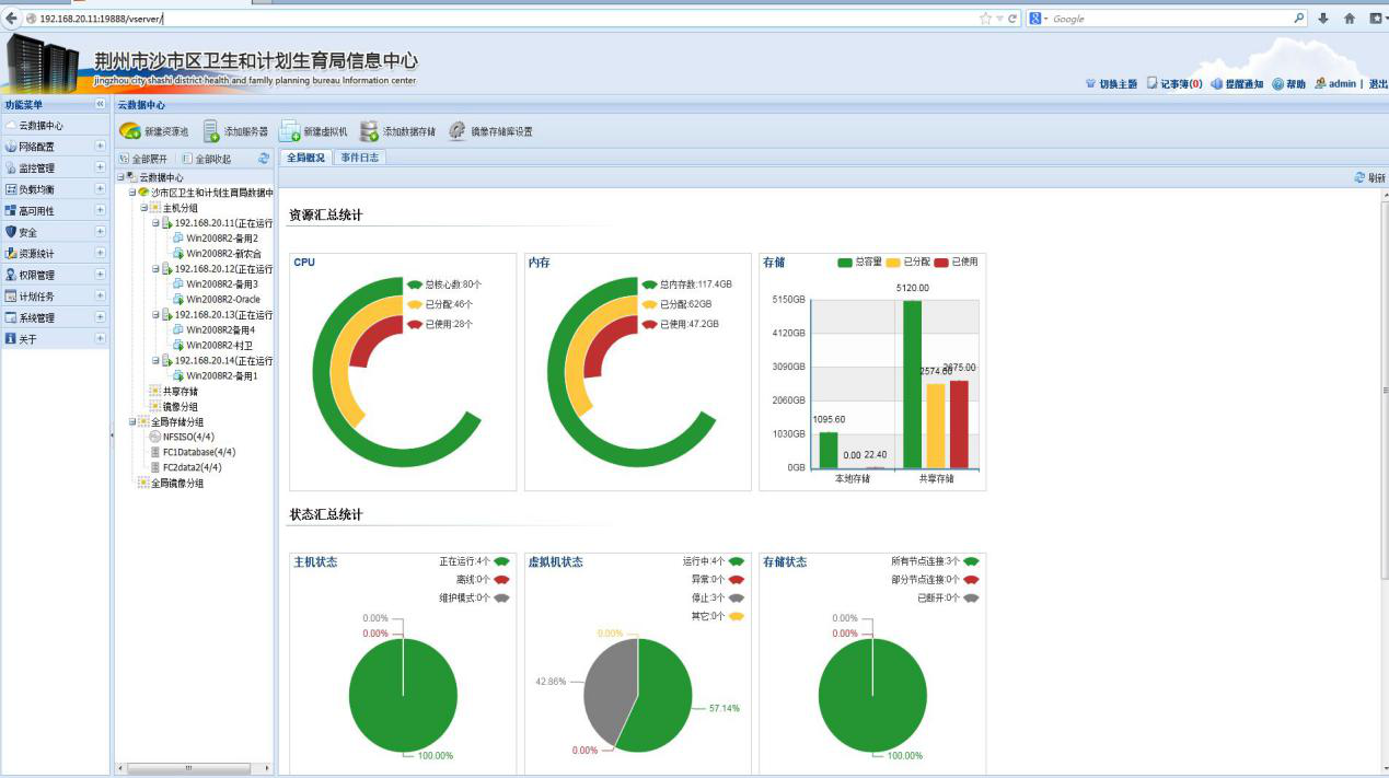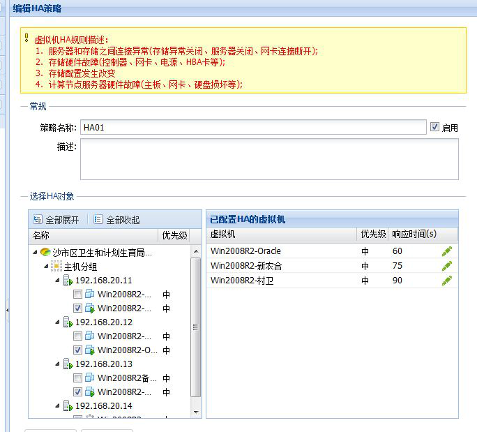 将数据库、新龙合、村卫生系统3个核心系统配置了动迁迁移策略,当该虚拟机所在的服务器故障,虚拟机会自动迁移到其他服务器上,保障业务运行连续性