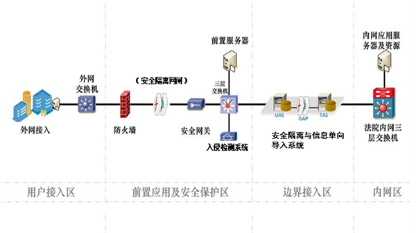 3.贯彻落实最高人民法院关于“司法公开”的重要举措,扩大司法信息公开力度,将湖北省汉江中级人民法院内网审判信息中需要公开的信息,通过安全接入平台,经法院门户网站(外网)向社会发布涉法新闻、公开司法信息,与公众直接沟通和交流,拓宽接受群众监督的渠道。要求必须在内网与外网之间建立安全接入平台,利用光闸(安全隔离与信息单向导入系统)、防火墙、网闸等安全防护设备,向内建立安全防护区,实现内网需要公开的信息通过门户网站向公众发布,并能防止病毒和黑客等入侵,确保内网信息安全。