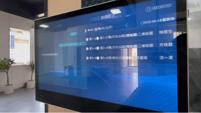 新建的14间机房入口处配备电子班牌,学生来到实验室上课学习,通过电子课牌查看实验室课程安排、实验室状态,便于预约空闲机房进行自主学习;管理员通过电子课牌直接查询到机房设备数据、上机课程、任课老师、空闲机器的情况,校方通知集中展示,课程、班级安排一目了然。