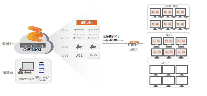 噢易桌面云系统提供智能PNP驱动技术,可实现对不同批次不同配置的异购终端系统的兼容,支持对终端异构终端进行统一管理,一个操作系统镜像可适用所有不同类型的胖终端、PC、笔记本等,更新一个镜像,便可达到更新全部终端的目的,大大降低管理维护工作,提升管理效率。
