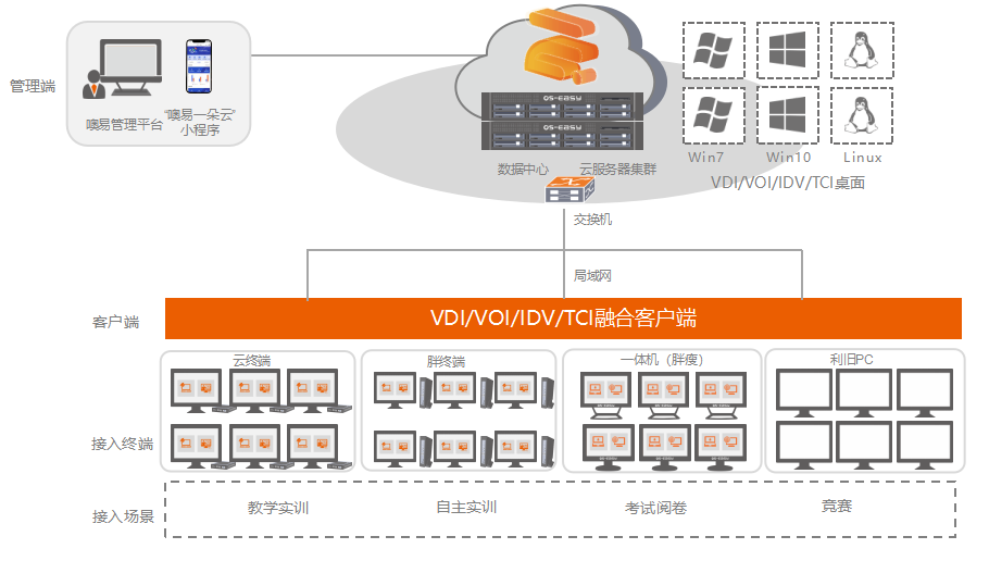 面向计算机公共实训室,构建以动手能力为主的IT基础环境,采用融合桌面云技术,按需交付实验实训、学生自主训练、考试竞赛所需的教学应用系统和环境,通过⼀致的Web视图界面,实现机房、设备、桌面的统一管理和集中运维。