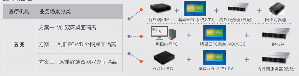 内外网隔离办公可以根据医院实际的架构选型、成本预算、布线改造等需求的不同提供三种灵活的建设方案。针对成本预算高、双布线物理隔离、瘦终端办公场景推荐VDI双网双桌面隔离;若考虑充分利旧PC资源、不改变现有网络结构需求推荐采用利旧PC+VDI外网桌面隔离方案;对于单终端、双网络布线场景的区县医院,兼顾安全和性价比采用IDV单终端双网双桌面隔离方案。