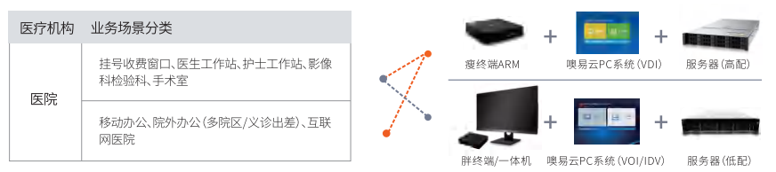 医疗办公场景多,不同场景终端承载业务,外接的设备,桌面系统使用需求都存在差异化,办公终端作为承载应用落地的最后一环,直接承载诊疗业务,其流畅高可靠运行、复杂外设接入、故障快恢复,数据安全等特性作为重要选型依据,终端电脑上云信息化建设中,需要针对用户需求特性,进行桌面架构和云终端设备的选型,接下来一起看看医疗场景应该如何来选择适合自身业务场景的云桌面。