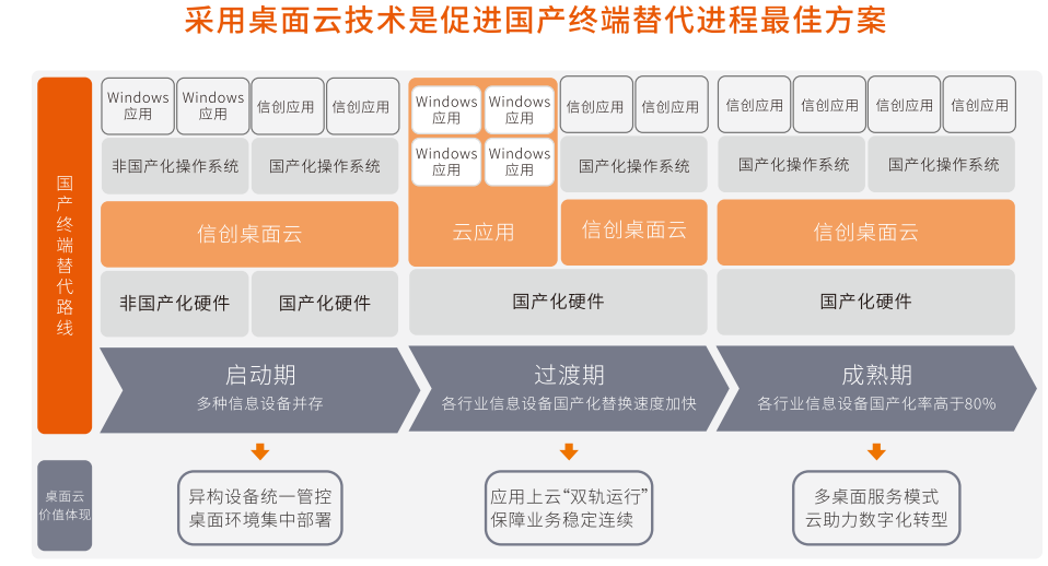 在“国产自主可控“政策的推动下,对各行业用户终端信息化系统建设来说,采用可信桌面云平台构建“服务器-桌面云-终端”的云办公业务模式,不仅衔接现有传统的办公及应用模式,对终端设备、桌面环境进行统一管理维护,还能促进信息化系统向国产自主可控方向迁移,有效支撑日常办公及移动协同等信息化需求。终端系统国产化是一个长期过程,需经历启动期、过渡期、成熟期三个阶段。
