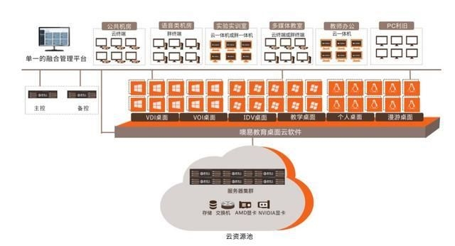 教育桌面云:为学校实验室机房、教学机房、图书馆、多媒体教室提供校园级桌面云方案,采用桌面虚拟化技术,用虚拟桌面替换传统 PC,桌面统一集中存放在云端,让终端设备通过网络连接,随时随地获取桌面环境。