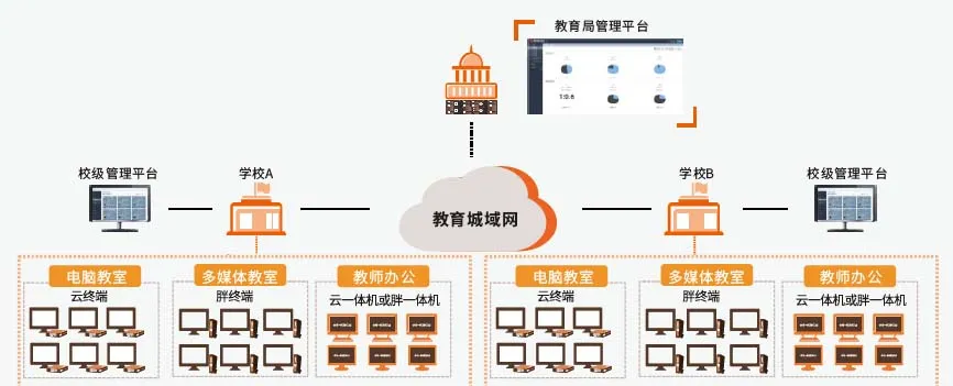 宜昌市夷陵区教育局平台为区域级云桌面平台,云服务器部署在教育局,教育局可通过单一IP地址访问和管理20多中小学校,学校可通过个人账号管理自己的校区,满足教育局区域云桌面建设。支持跨学校多区域资源汇总分析,便于教育局 掌 握各校云 教室使用 占比、 教学应用 情况、 桌面使 用数据 ,为信息化教学分析提供数据 参考。