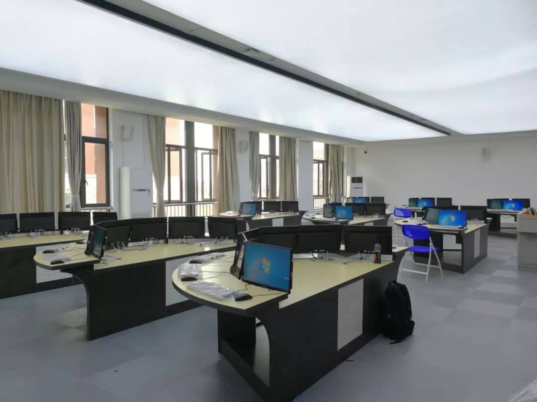 广西医科大学本部校区教务处采用1台管理服务器,13台云计算服务器用于承载用户桌面,终端采用500台21.5寸的云计算一体机,搭配支持升降的实验桌,上机翻转上升终端,下机收纳下降桌面,大气美观!