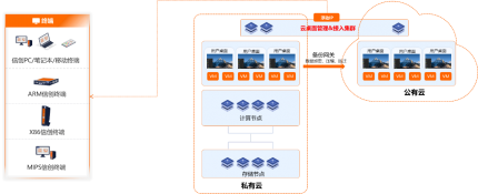 部署一套虚拟桌面平台,即可同时接管用户的公有云及私有云环境,用户通过统一的噢易云桌面控制台,可根据业务需要按需调用公有云或私有云资源来交付虚拟桌面。