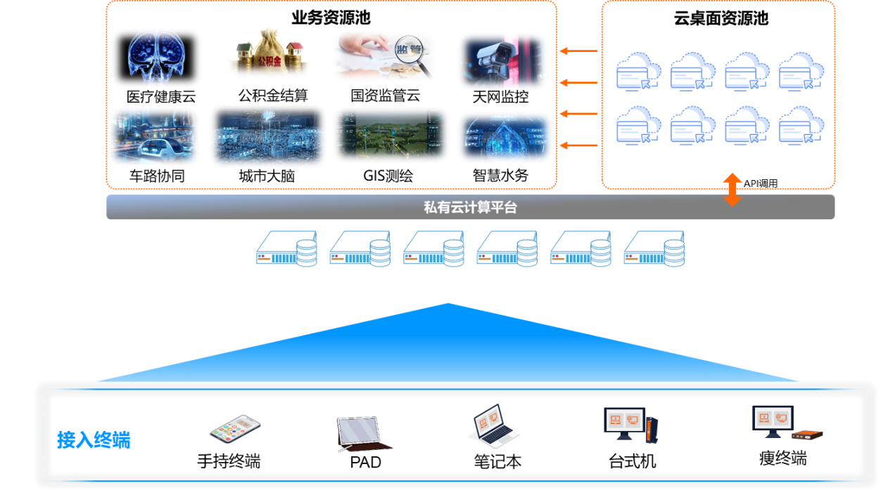 基于用户已有的私有云资源快速构建虚拟桌面平台,使云桌面作为私有云平台上的一个PaaS服务,面向私有云上的租户提供虚拟桌面服务。