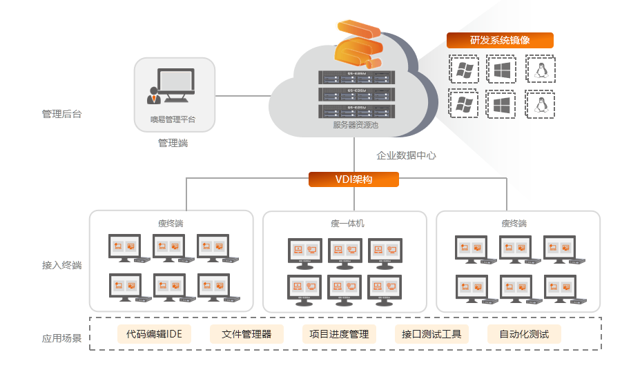 噢易远程开发测试&运维解决方案面向研发测试办公,提供流畅的开发体验。支持桌面环境的快速创建、部署、统一管控与运维;在便捷性、弹性、安全、高性能等方面,具有超越传统PC的优势,当开发、测试环境异常时能够快速恢复运行环境,保障办公的业务效率和数据安全。