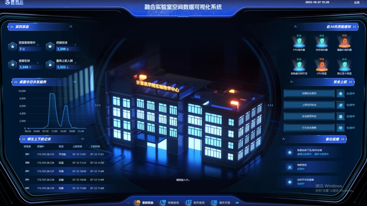 大屏可视化展示:通过一楼大屏实时呈现上机人数、实验室占用率、课程排课情况等核心数据,成为参观交流的核心展示载体。